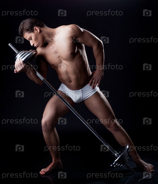 Привлекательный парень позирует со штангой