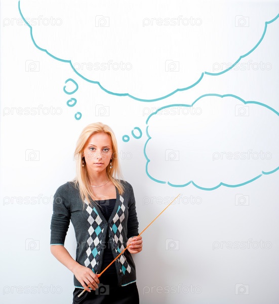 Молодая учительница стоит с указкой возле белой доски