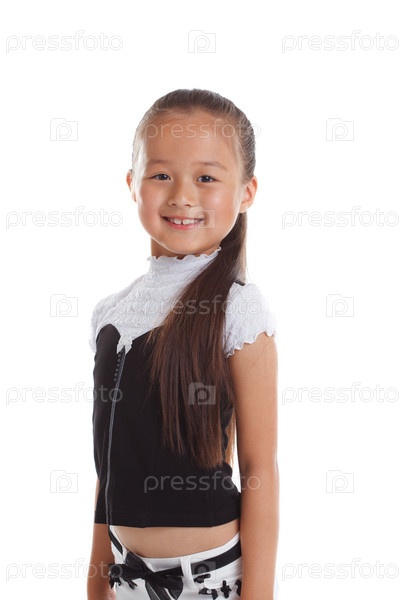 Веселая девочка позирует в модной одежде