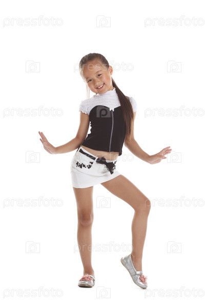 Веселая девочка позирует в модной одежде