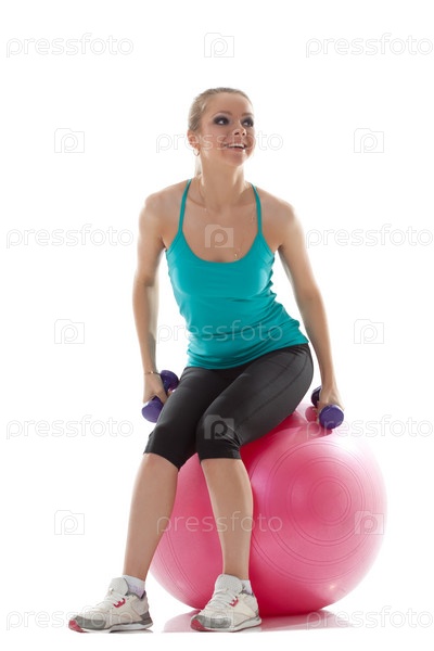 Спортсменка позирует с гантелями и мячом