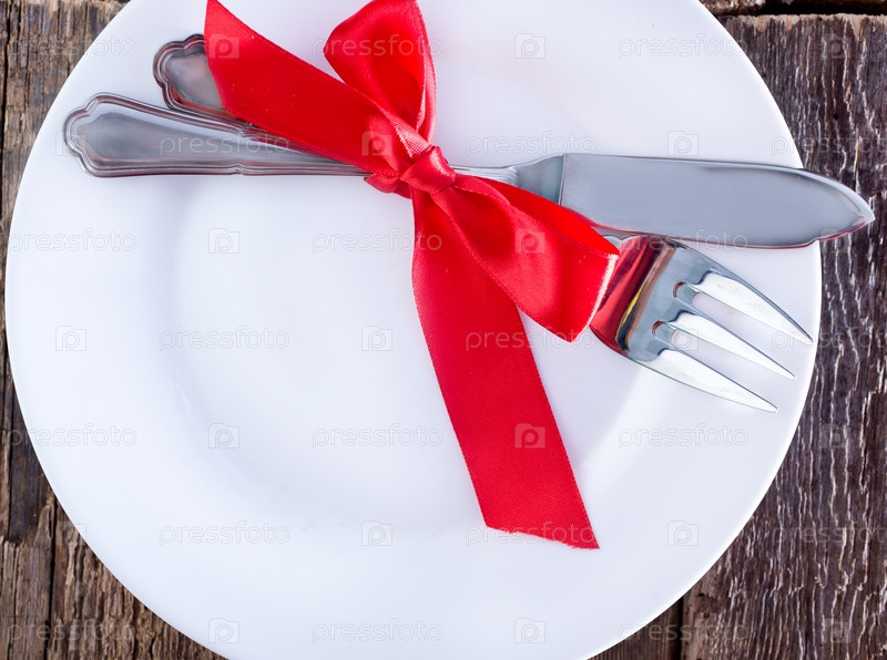 Вилка, тарелка и нож на столе