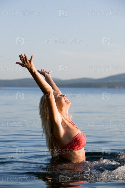 Красивая блондинка купается в голубой воде с поднятыми руками