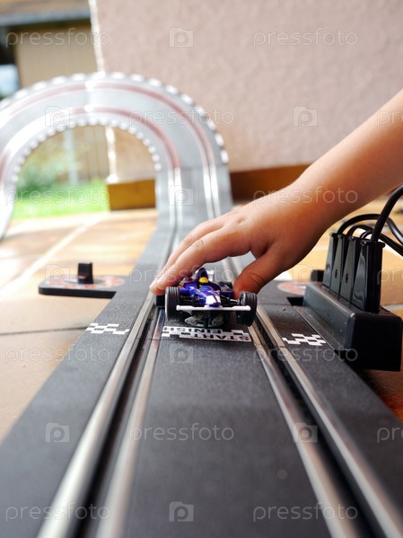 Рука ребенка, играющего с машинкой на игрушечной дороге