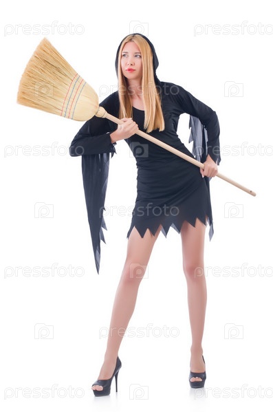 Женщина с метлой на белом фоне
