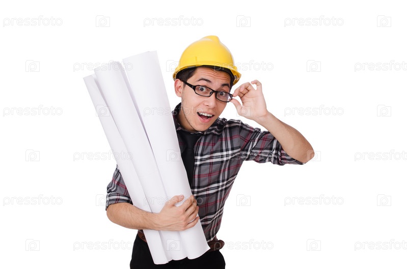 Забавный человек с чертежами на белом фоне