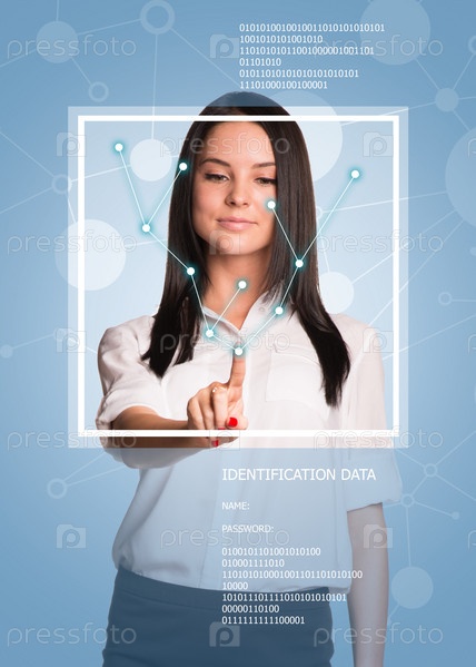 Брюнетка в платье указывает пальцем на виртуальную сетку