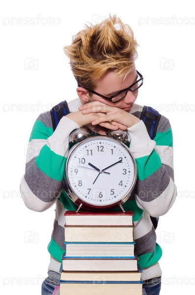 Студент с часами, изолированный на белом