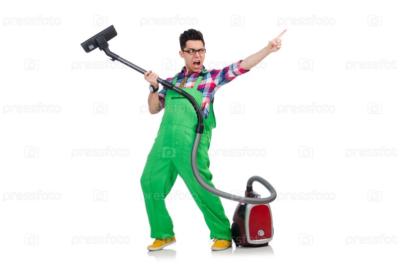 Человек в зеленой комбинезоне с пылесосом