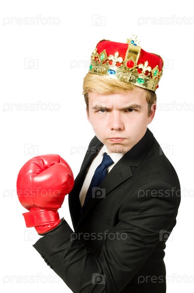 Бизнесмен в короне и боксерских перчатках
