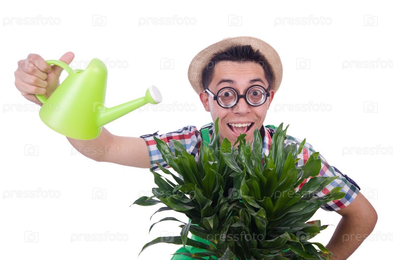 Забавный человек поливает растение