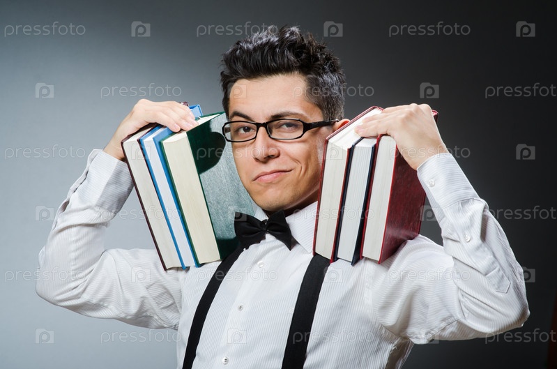 Мужчина в очках с книгами на плечах