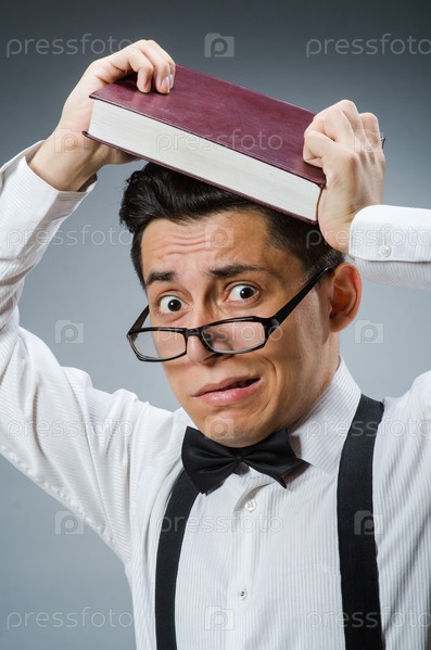 Молодой мужчина в очках с книгой на голове