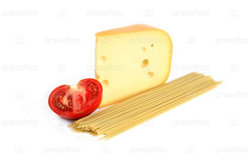 Кусок сыра, спагетти, помидор на белом фоне