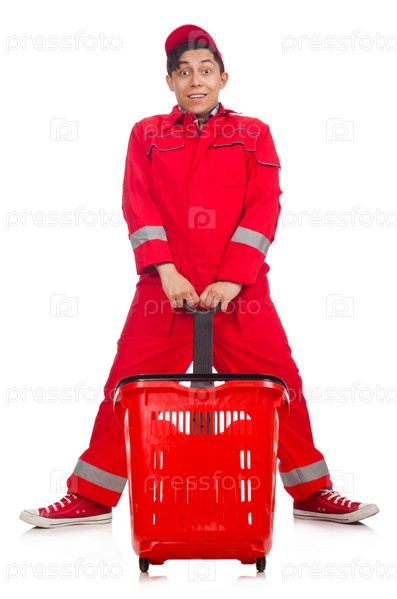 Мужчина в красном комбинезоне с магазинной тележкой