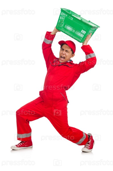 Мужчина в красном комбинезоне с магазинной тележкой