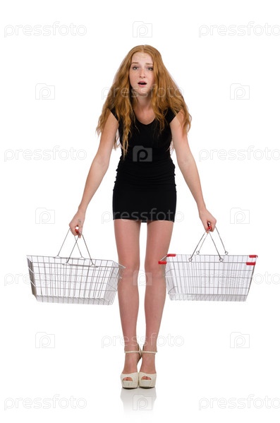 Женщина с магазинной корзиной на белом фоне