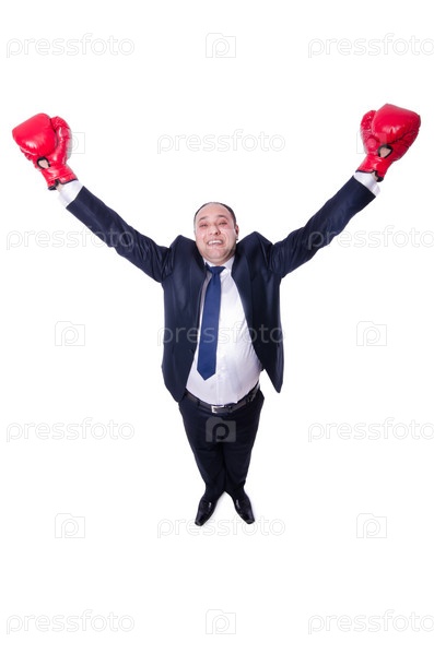 Бизнесмен в боксерских перчатках на белом фоне