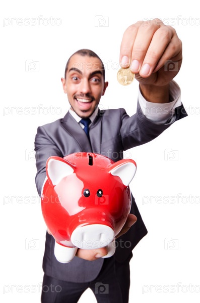 Забавный человек с копилкой на белом фоне