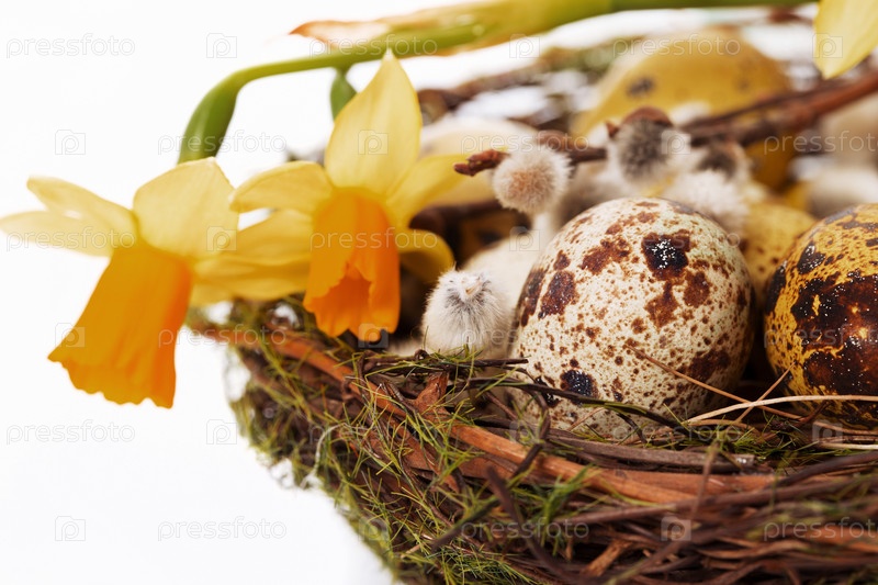 Пасхальные яйца в гнезде и нарциссы