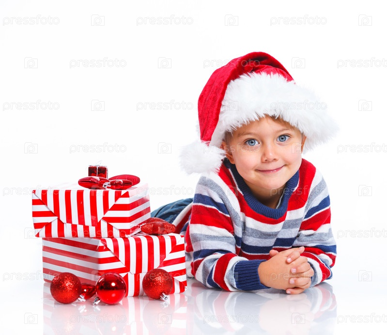 Маленький мальчик в шапке Санта-Клауса с подарком