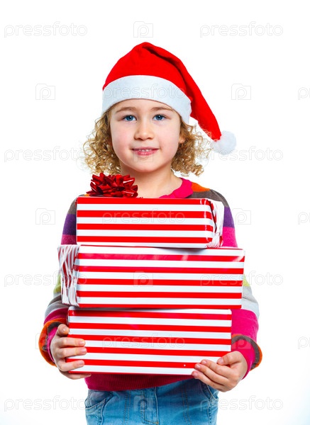 Маленькая девочка в шапке Санта-Клауса с подарком