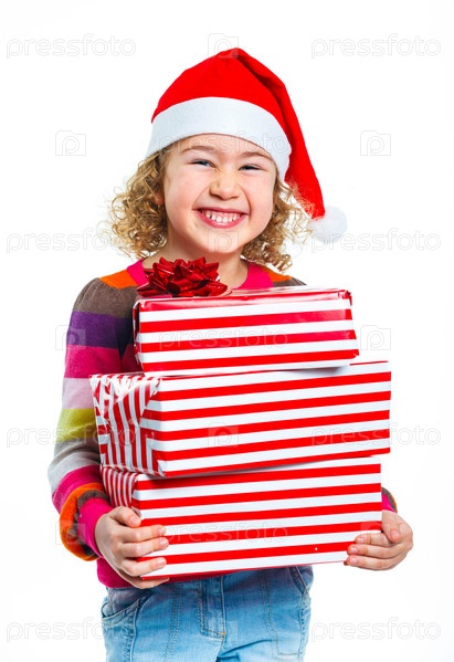 Маленькая девочка в шапке Санта-Клауса с подарком