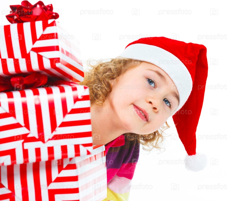 Маленькая девочка в шапке Санта-Клауса с подарком