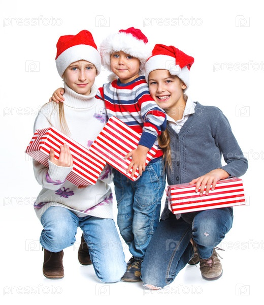 Счастливые дети в шапках Санта-Клауса