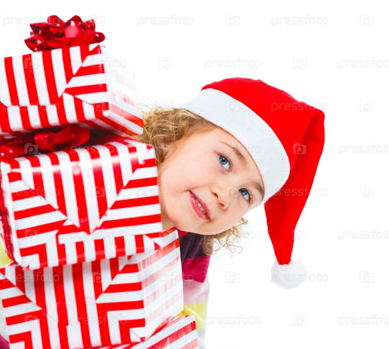 Маленькая девочка в шапке Санта-Клауса с подарком