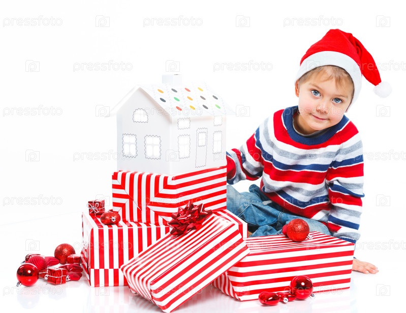 Маленький мальчик в шапке Санта-Клауса с подарками