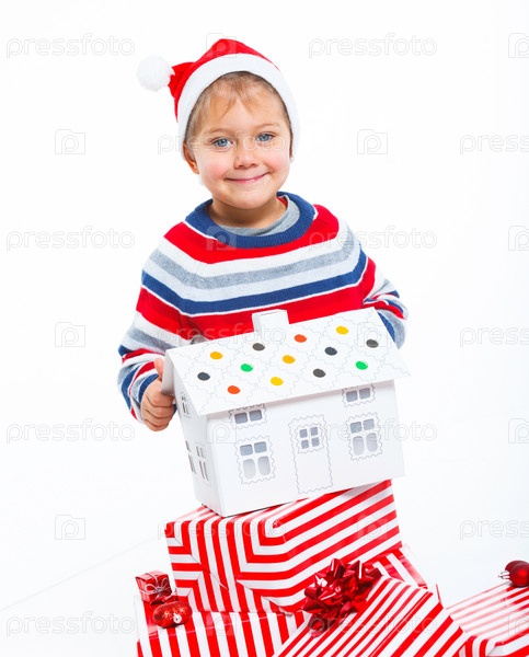 Маленький мальчик в шапке Санта-Клауса с подарками