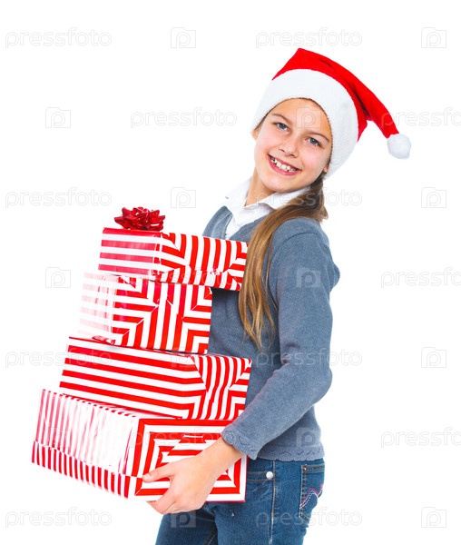 Девочка в шапке Санта-Клауса с подарками