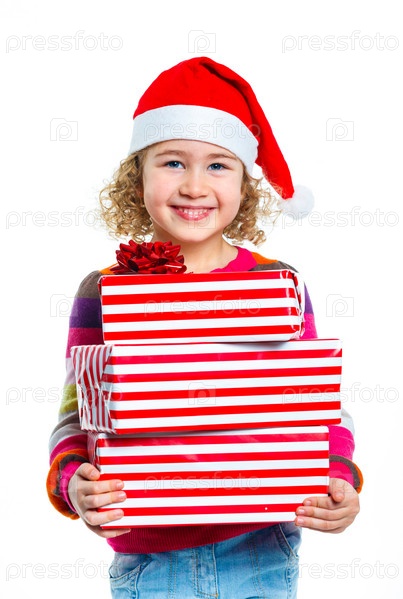 Девочка в шапке Санта-Клауса с подарками