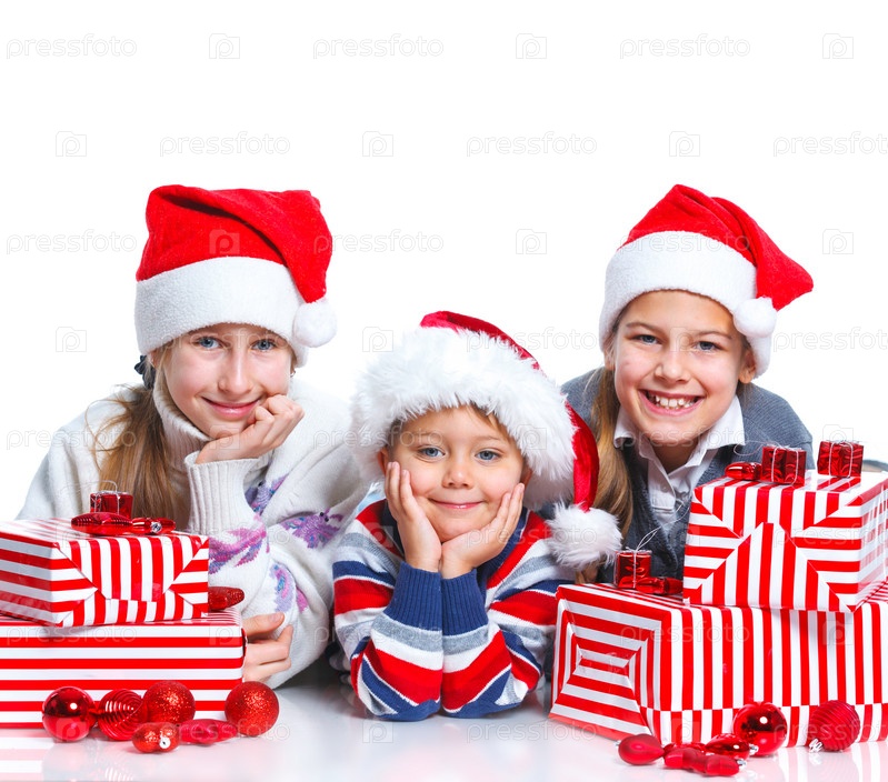 Счастливые дети в шапках Санта-Клауса