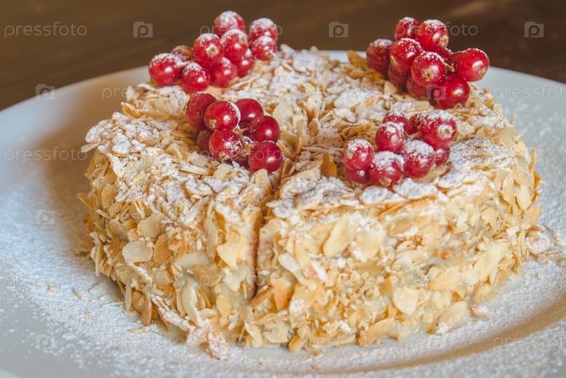Торт с ягодами красной смородины на белом подносе