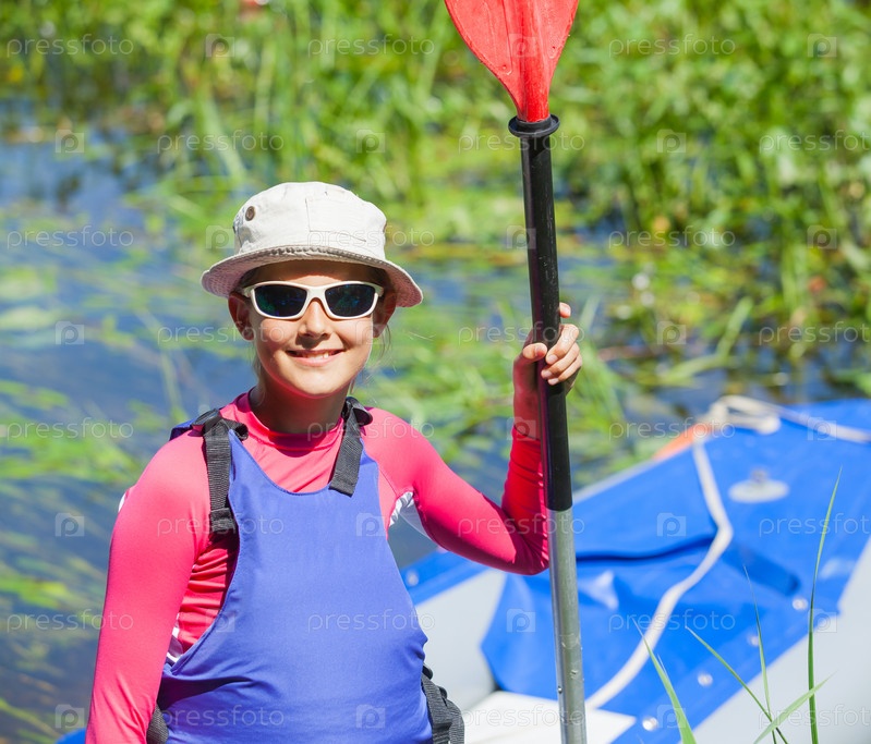 Девочка держит весло возле каяка