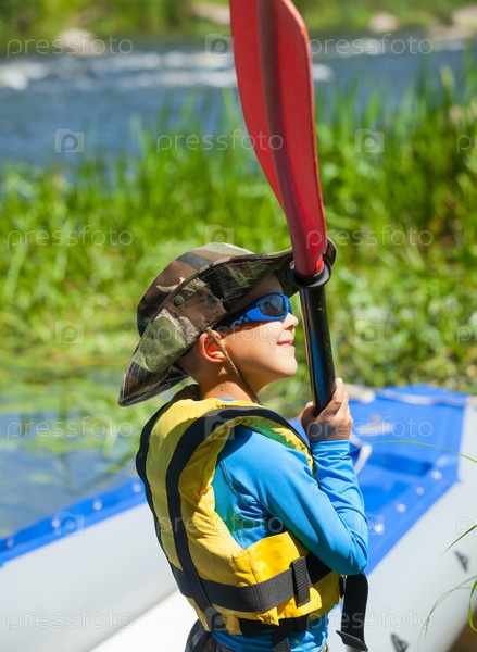 Счастливый мальчик с веслом у каяка