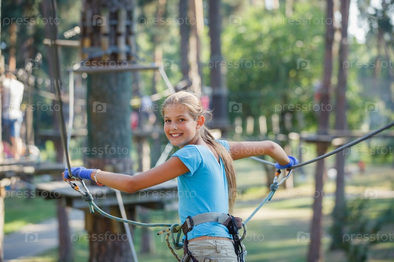Девочка в парке для занятий скалолазанием