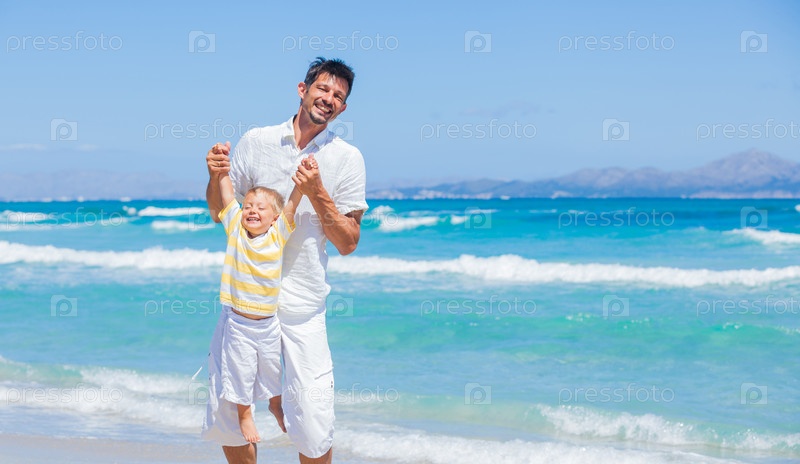 Отец и сын играют на пляже