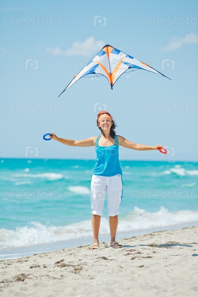 Женщина с воздушным змеем на пляже