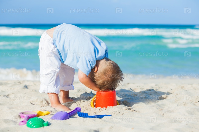 Мальчик с игрушками на пляже