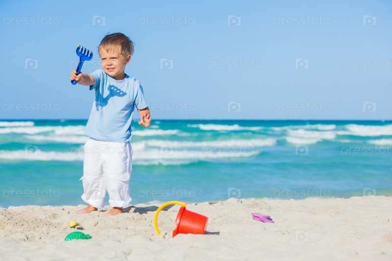 Мальчик с игрушками на пляже
