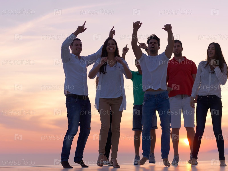 Группа веселых людей на фоне неба