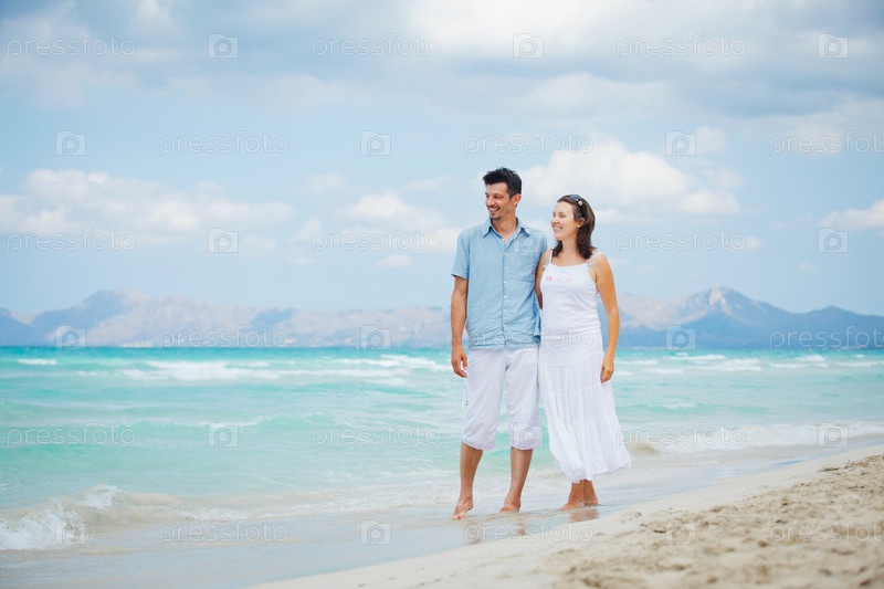 Счастливая молодая пара гуляет на пляже