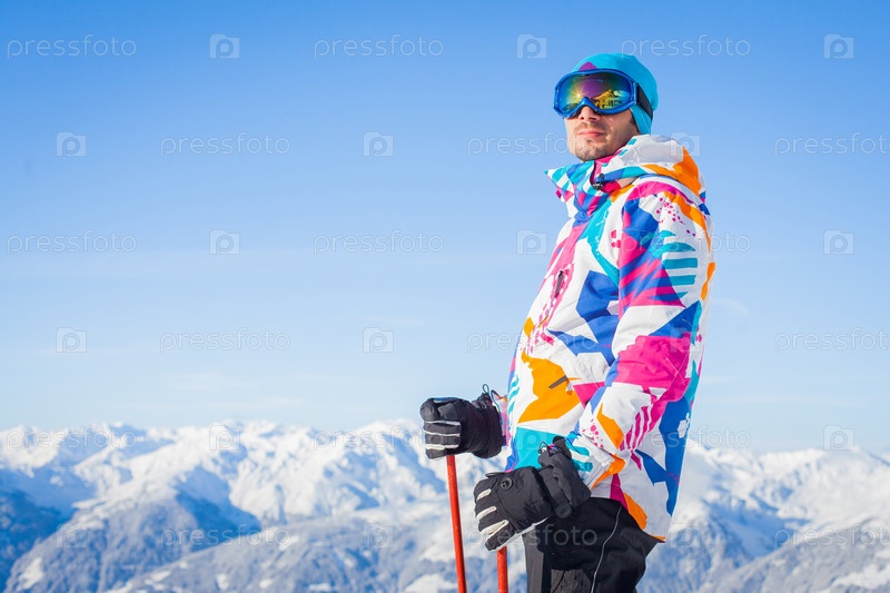 Молодой человек с лыжами и лыжной одеждой