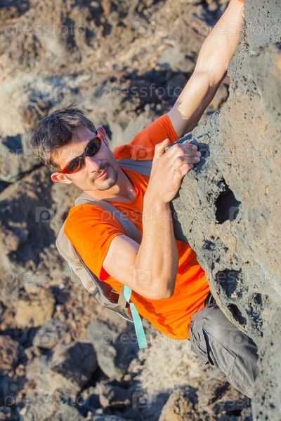 Молодой человек с рюкзаком поднимается на гору