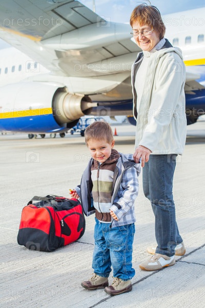Мальчик и его бабушка садятся в самолет