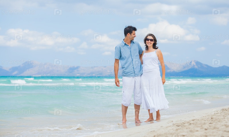 Счастливая молодая пара гуляет на пляже