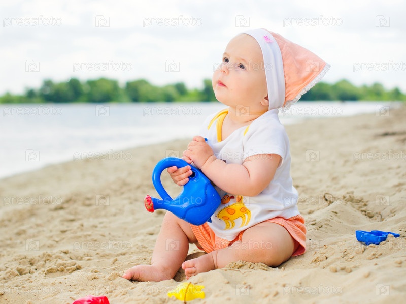 Милая девочка играет в песке на пляже